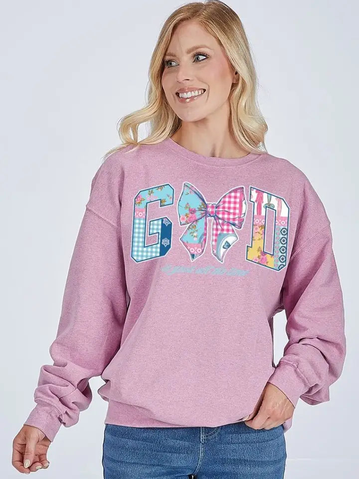 Bubblegum pink long sleeve crew with the phrase 'God is good all the time' with the letters of 'God' being filled with a quilted pattern and the 'O' being a bow. 55% cotton 45% polyester. Range sizing.
