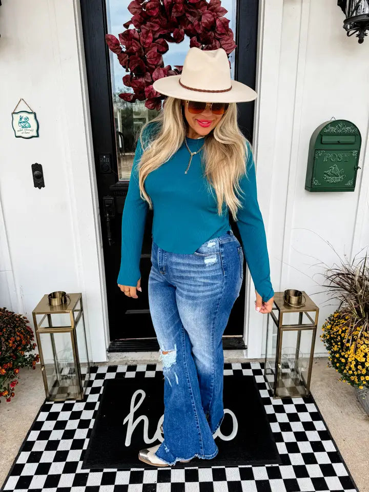 Features a high/low front/back with curved sides that form fitting, small waist appearance! Features thumbhole sleeves.