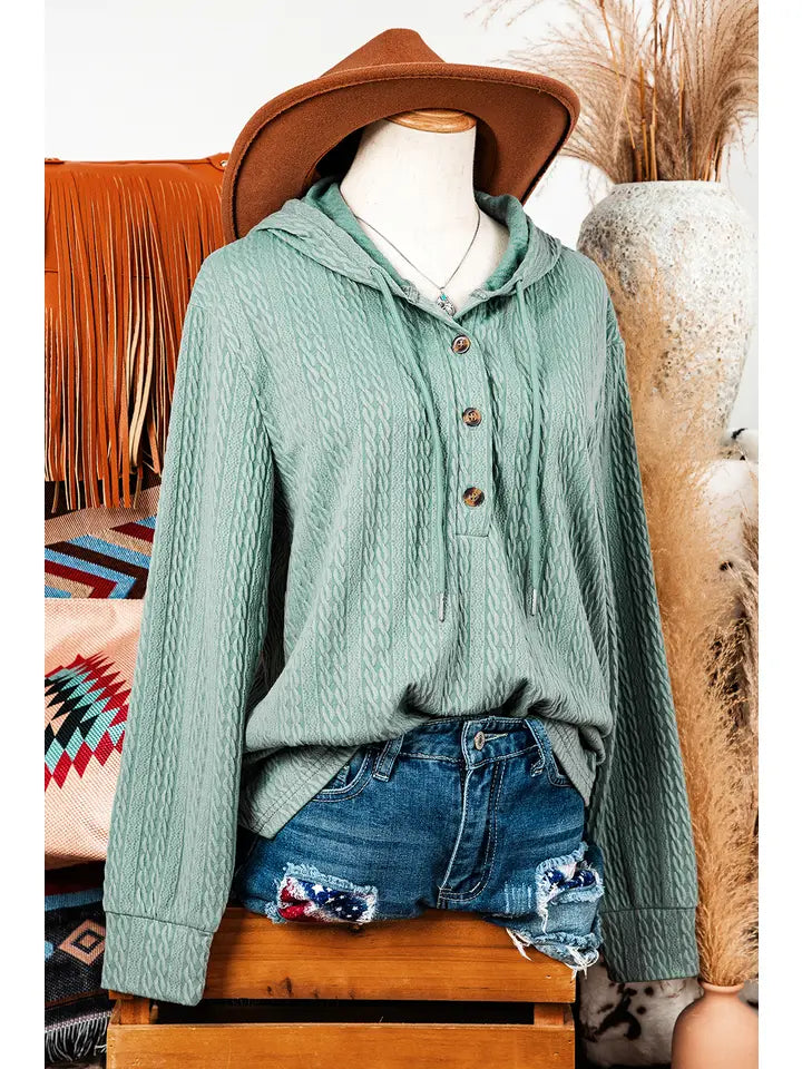 Fall Button Front Textured Drawstring Hooded Long Sleeve Top