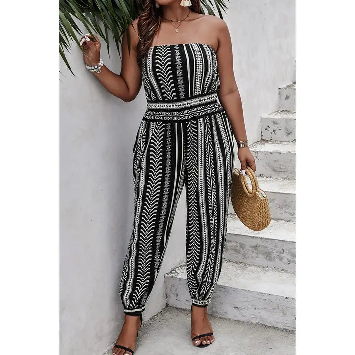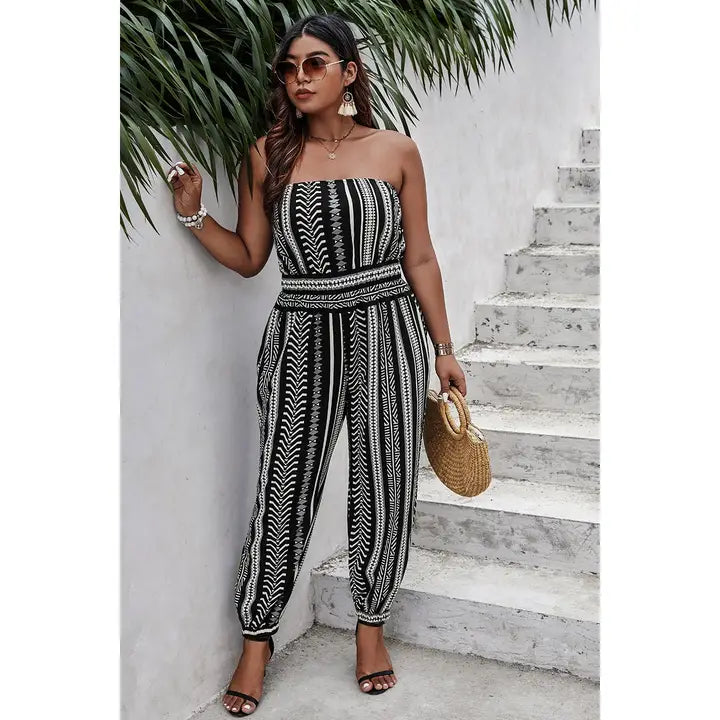 Material: 100% PolyesterFeatures: Plus Size Print Off Shoulder Sleeveless JumpsuitOccasion: Casual/ Daily/Outdoor/Vacation/School/Going Out.