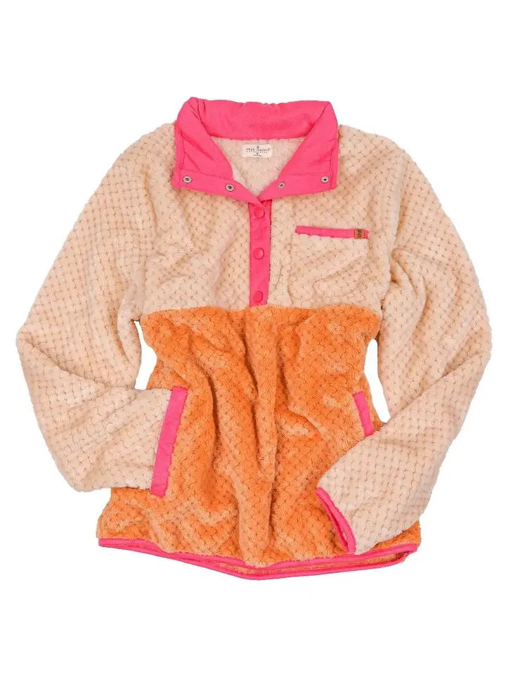 These honey colored simply soft pullovers will keep you warm all season long. Features a duo color design, two side pockets, and a chest pocket. Made of 100% polyester.
