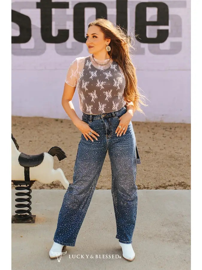 Add serious sparkle to your Western retail lineup with our Rhinestone Studded Western Workwear Jeans by Lucky & Blessed. These high-rise, relaxed-fit denim pants are fully embellished with shimmering rhinestones that create a dazzling yet rugged silhouette perfect for rodeos, concerts, and everyday cowgirl flair. Featuring deep utility-style pockets, reinforced seams, and a side hammer loop detail, these jeans merge industrial durability with feminine glam. Designed in a flattering straight-leg cut, they offer a comfortable, full-length fit ideal for boots or heels. Crafted for bold women who love to shine on and off the ranch, these jeans bring runway-inspired sparkle to classic workwear. Pair them with a graphic mesh top or a pearl snap button-down to complete the Western glam look.